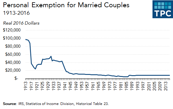 This chart shows the inflation adjusted standard deduction. You can see at its inception (1913), the income tax was intended to be levied against upper middle class and upper class families only. In today’s dollars the standard deduction for a family was $97,000. That’s not a typo. That would mean you would fill out a 1040EZ, pay nothing, and be done taxes for the year. What happened? Mostly inflation and government spending on war being an excuse to lower the deduction. The effect of inflation would be clearer if the chart were in log scale… This goes to show how taxes can be hidden in plain sight by not adjusting for inflation.
