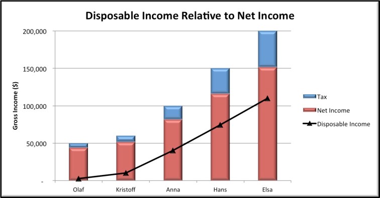 Kristoff represents the standard, Olaf is below, the rest above. The typical interpretation of a graph like this is for someone to say, “See how much more Elsa has taken from her than Olaf!? Stop over-taxing the rich.”